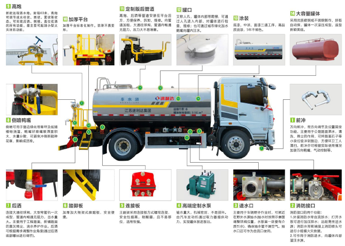 ● 采用專用定制版大功率水泵,具有性能優(yōu)良、工作可靠、效率高、流量大、等特點,前沖可達雙向8車道,后灑可達雙向4車道,高炮最大可達40米射程。